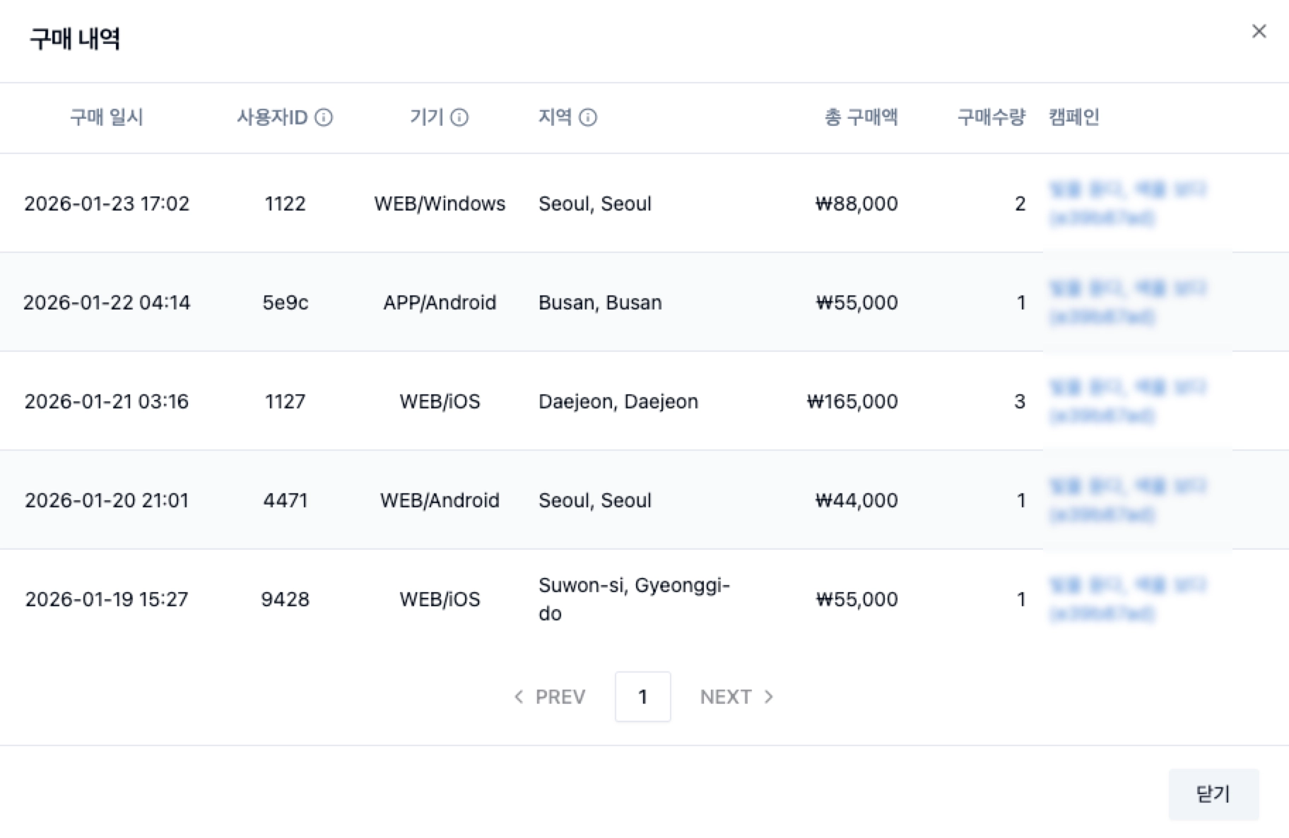 ์ด๋ค ์ฌ์ฉ์๊ฐ, ์ด๋ค ๊ธฐ๊ธฐ์์, ์ผ๋ง๋ฅผ ๊ตฌ๋งคํ๋์ง ํ๋์ ํ์