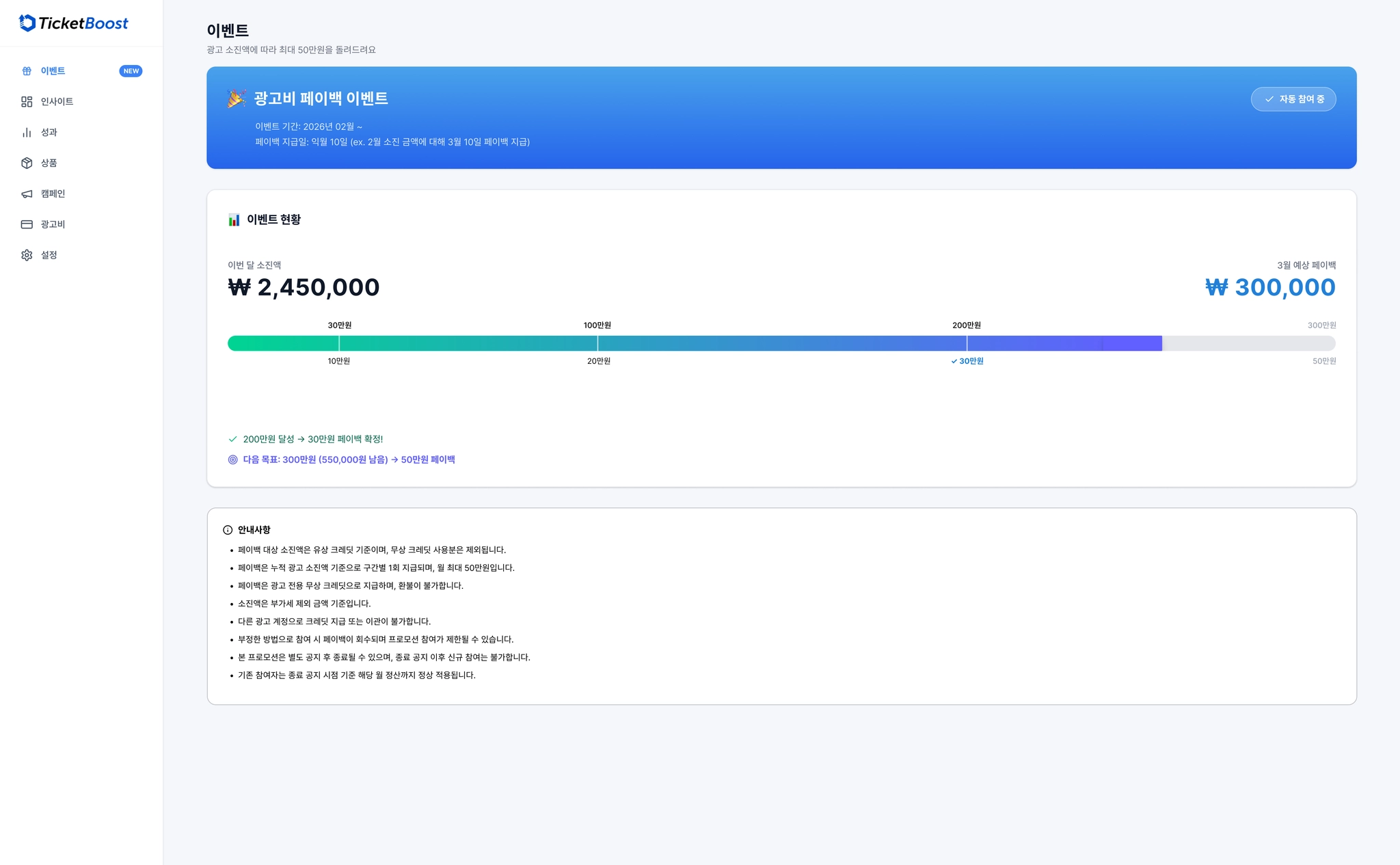 ๊ด๊ณ ์์ง์ก ๊ตฌ๊ฐ์ ๋ฐ๋ผ ์ต๋ 50๋ง์๊น์ง ๋ฌด์ ํฌ๋ ๋ง์ผ๋ก ํ์ด๋ฐฑํด ๋๋ฆฝ๋๋ค.