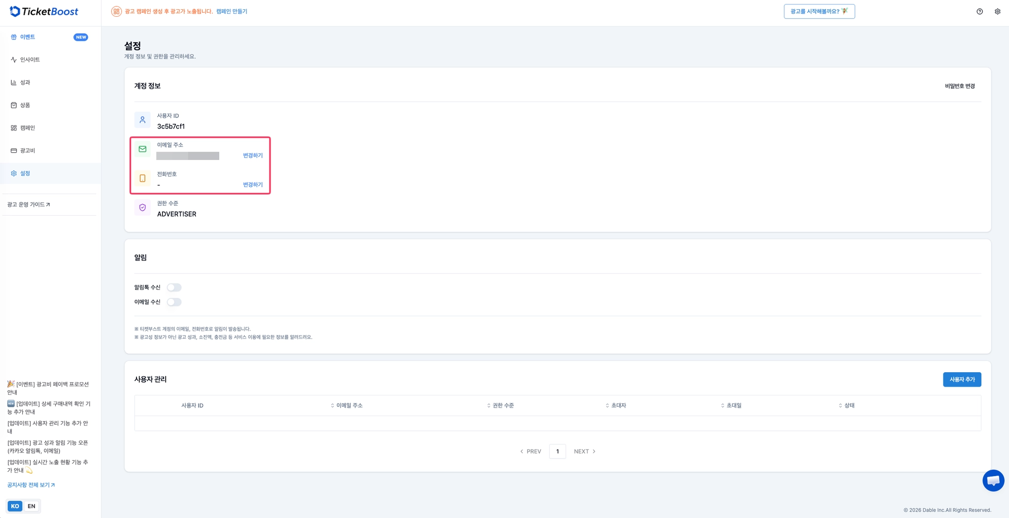 대시보드에 등록된 이메일 주소와 전화번호를 수정할 수 있는 기능입니다.