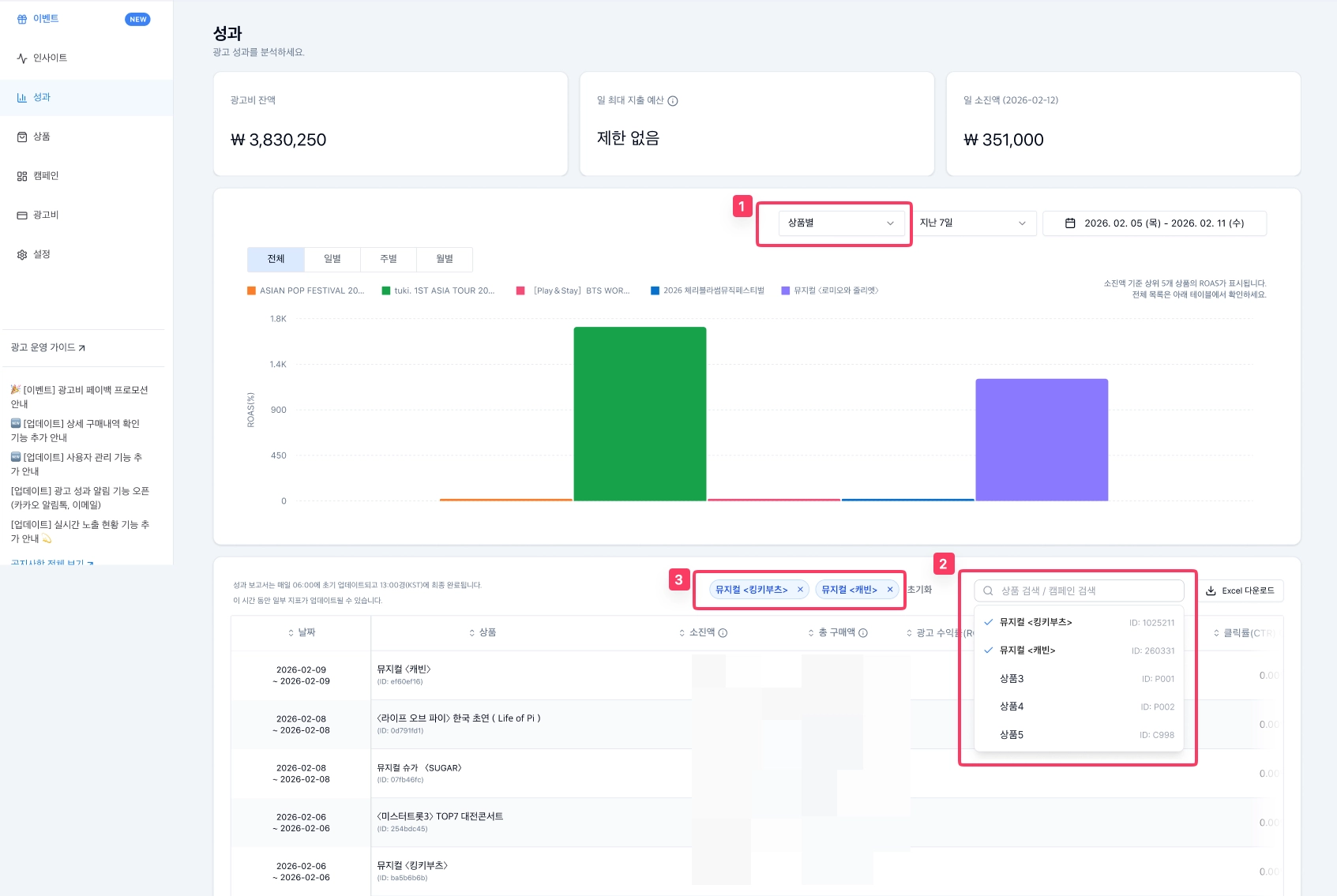 다중 선택 비교 : 관심 있는 캠페인/상품을 여러 개 골라 성과를 나란히 비교해 보세요.