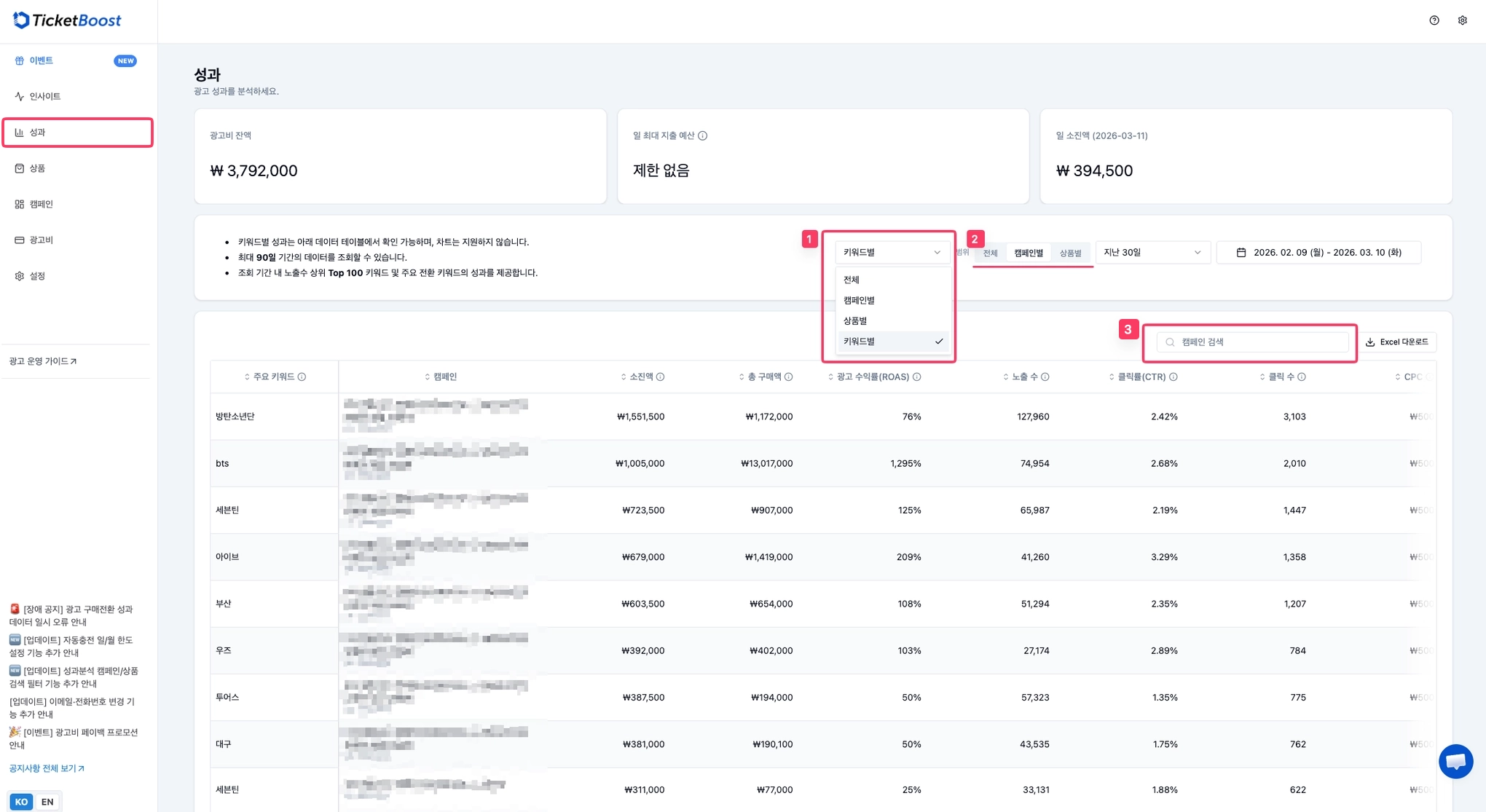 ΈμΆλ κ²μ ν€μλλ³λ‘ μμ§μ‘, ROAS, ν΄λ¦μ, μ νμ¨ λ± μ£Όμ μ±κ³Ό μ§νλ₯Ό νλμ λ³Ό μ μλ κΈ°λ₯μ